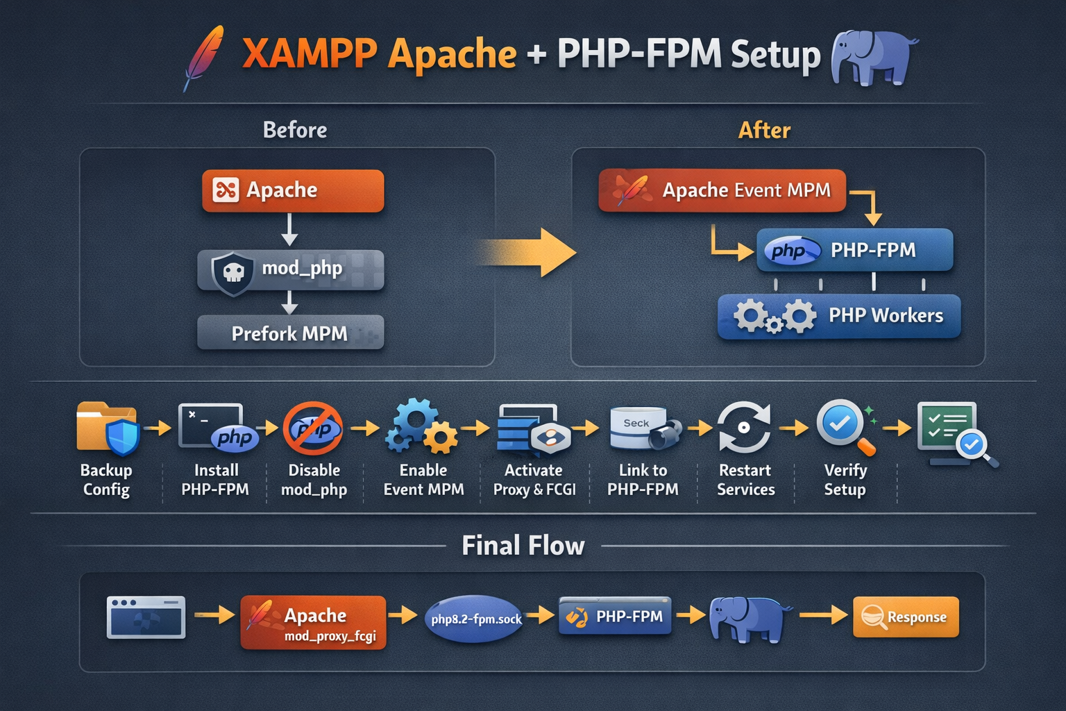 This setup keeps Apache from XAMPP and uses PHP-FPM from the OS. XAMPP’s main Apache config files on Linux are…