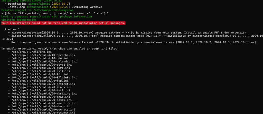 require ext-dom * -> it is missing from your system. Install or enable PHP’s dom extension.