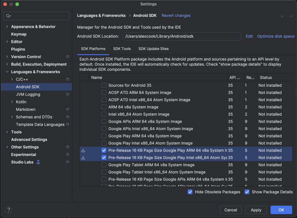 Step 2: In theย SDK Platformsย tab, checkย Show Package Details, then expand theย Android VanillaIceCreamย or higher section and select one or both of the following emulator system images, depending on the virtual devices you want to create: