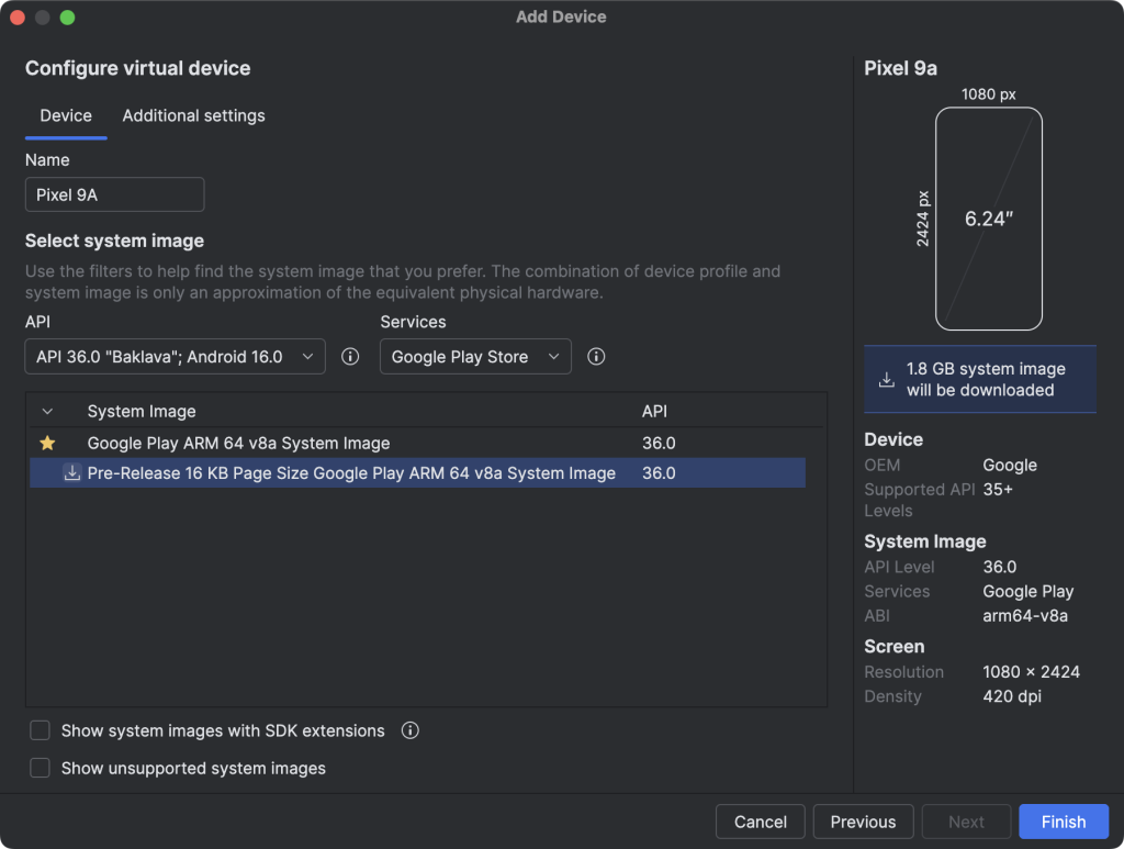- Google APIs Experimental 16ย KB Page Size ARM 64 v8a System Image