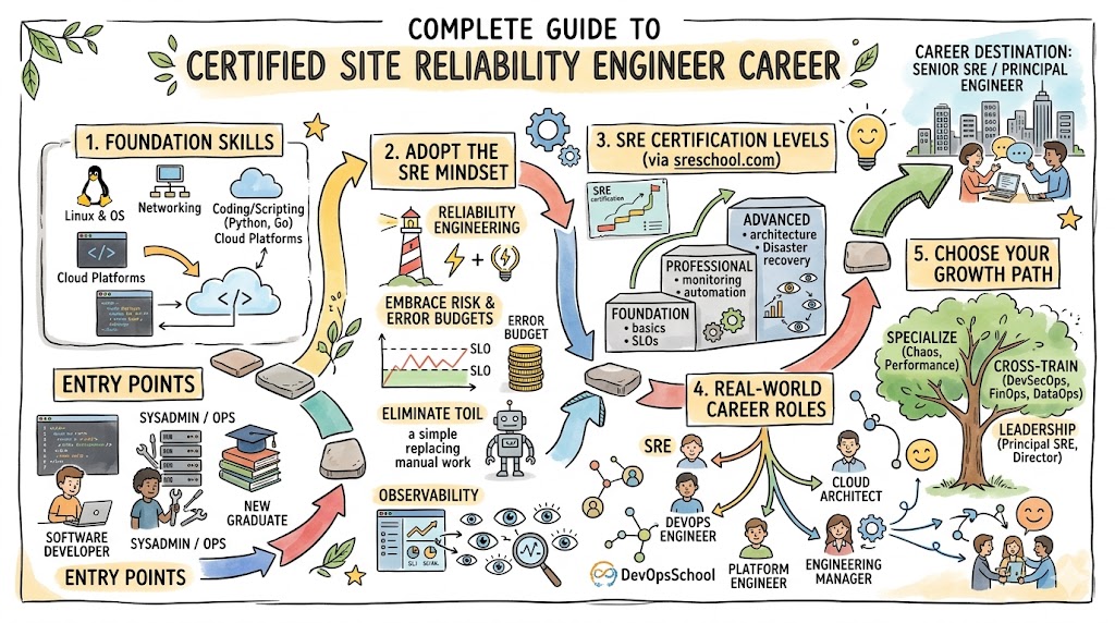 The Certified Site Reliability Engineer program is a comprehensive framework designed to bridge the gap between traditional operations and modern software engineering. This guide is written for professionals looking to navigate the complexities of cloud-native infrastructure, high availability, and automated operations. Whether you are a software developer transitioning into infrastructure or a sysadmin looking to modernize your skill set, understanding the roadmap provided by sreschool is crucial for making informed career decisions. By following the standards set by DevOpsSchool, this certification ensures that engineers are equipped with the mental models and technical rigor required to manage large-scale production environments effectively.