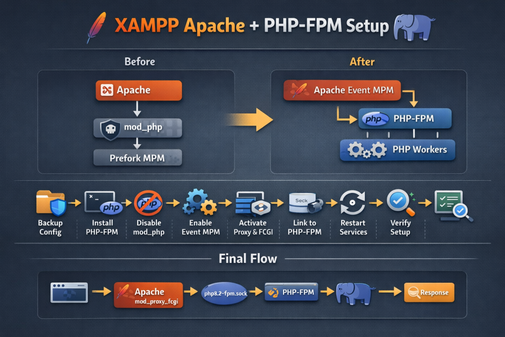 This setup keeps Apache from XAMPP and uses PHP-FPM from the OS. XAMPPโs main Apache config files on Linux are typically /opt/lampp/etc/httpd.conf and /opt/lampp/etc/extra/httpd-xampp.conf. Apacheโs event MPM is built to serve more requests simultaneously, and PHP-FPM is PHPโs FastCGI process manager. To connect Apache to PHP-FPM, Apache needs mod_proxy and mod_proxy_fcgi. (apachefriends.org)